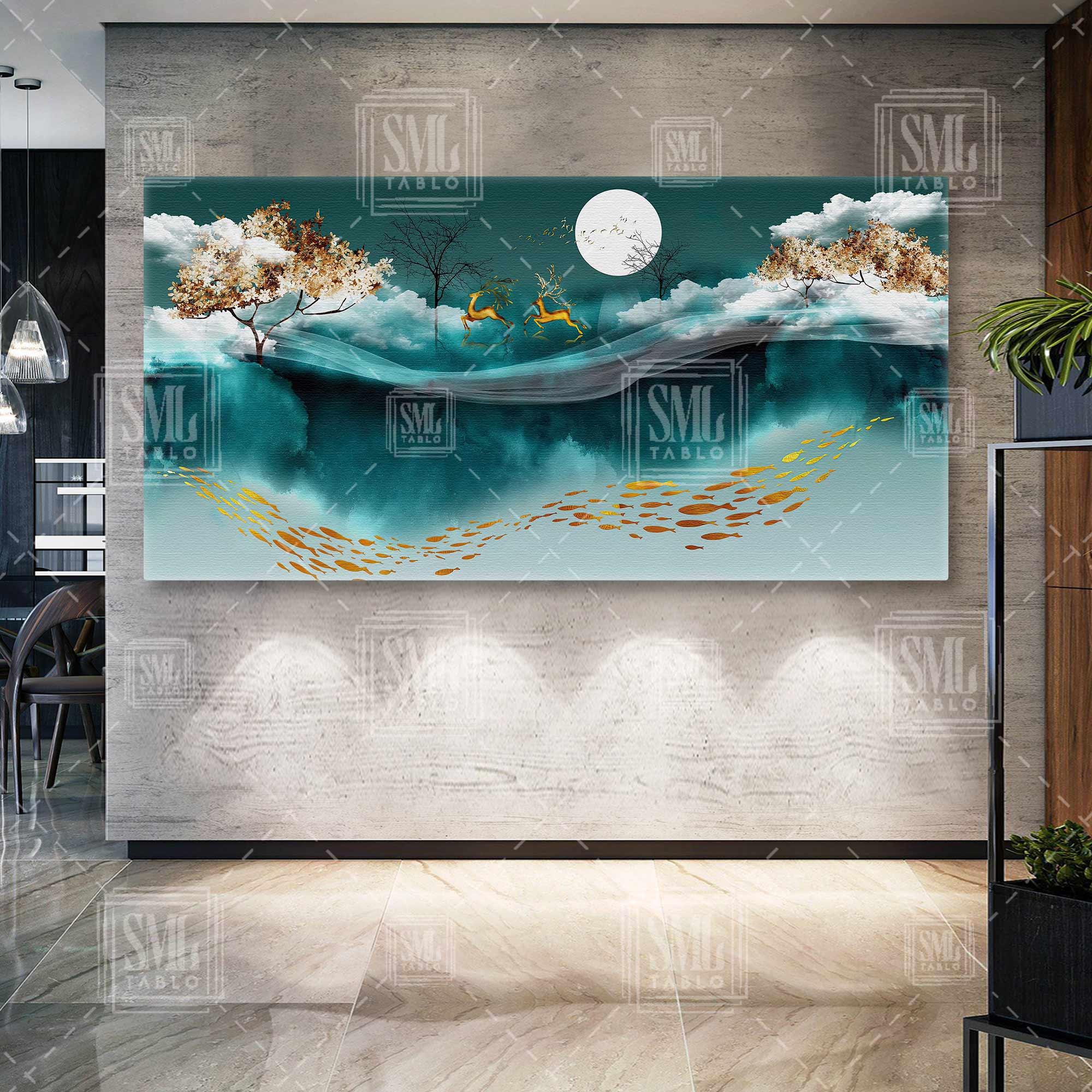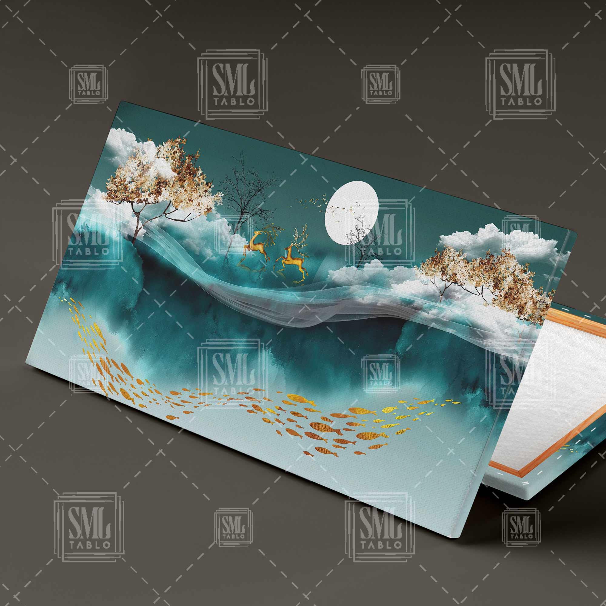 | Etiketler | Ay Işığında Bir Gece Altın Geyik ve Balıklar Boynuz Turkuaz Gökyüzü Enine Yatay Kanvas Tablo Tablosu Tabloları Tuvali |