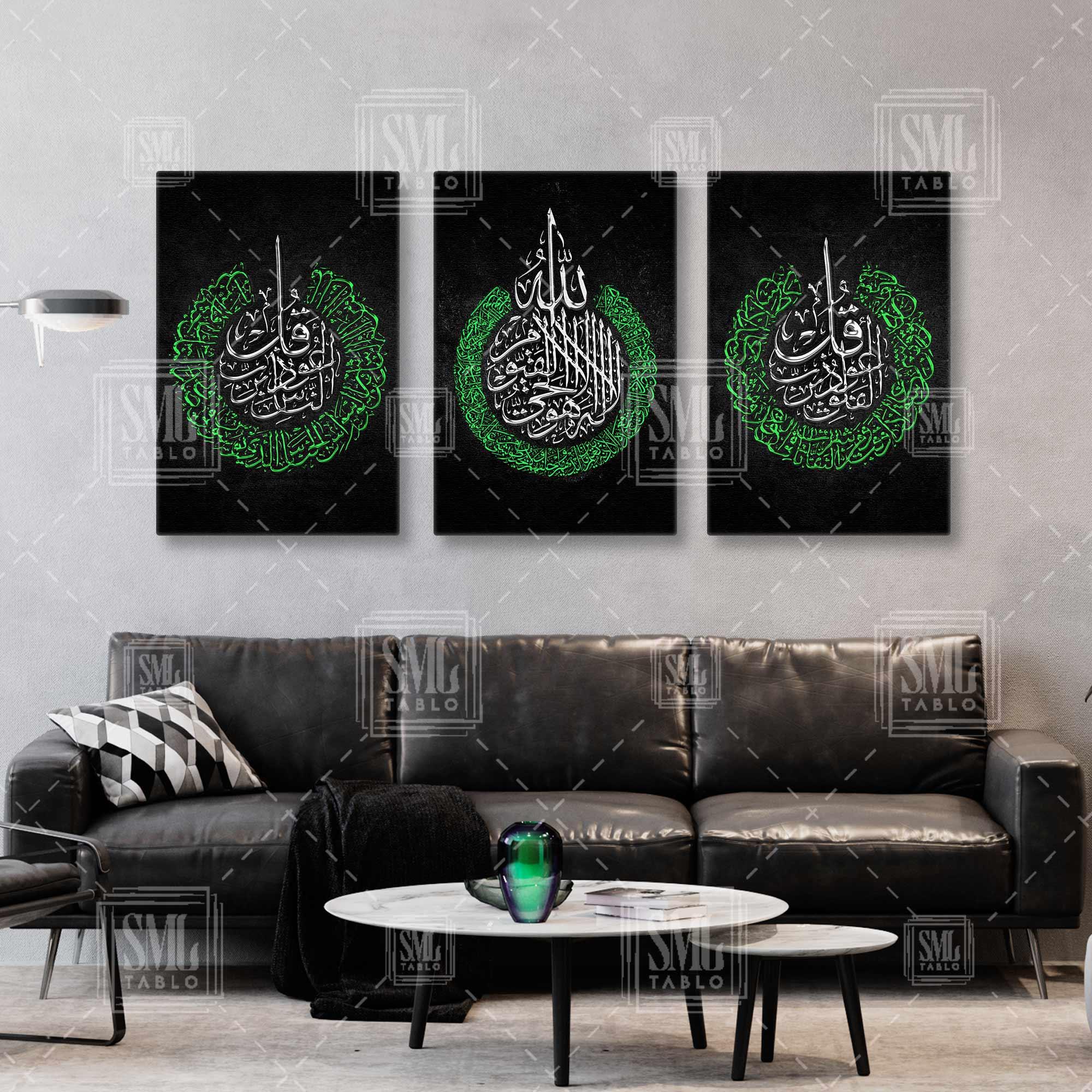 | Etiketler | Gümüş ve Yeşil Nas ve Felak Suresi Ayetel Kürsi Hat Sanatı Kaligrafi Üçlü Kombin 3 lü Set Kanvas Tablo Tablosu Tabloları Tuvali |