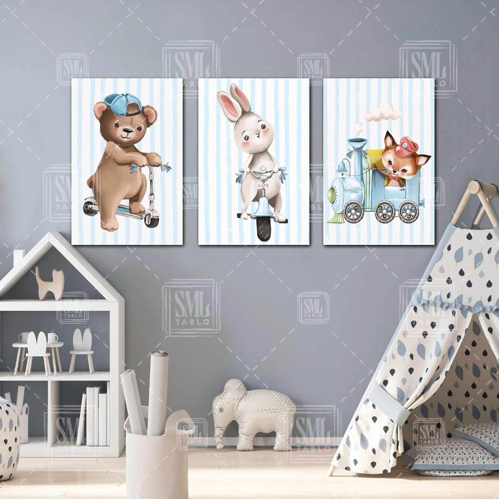 | Etiketler | Makinist Tilki Bisikletli Tavşan Ayı Mavi Tren Çocuk Odası Dekor Üçlü Kombin 3 lü Set Kanvas Tablo Tablosu Tabloları Tuvali Poster Posteri |