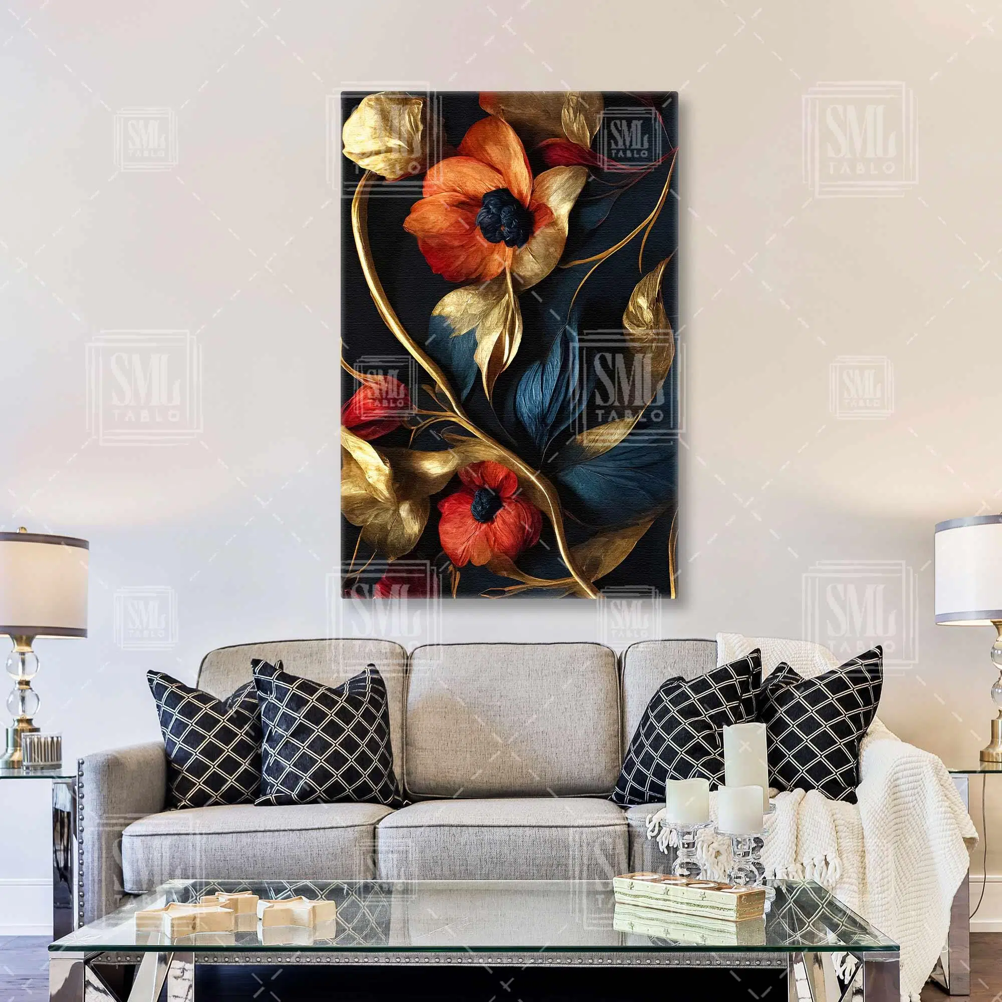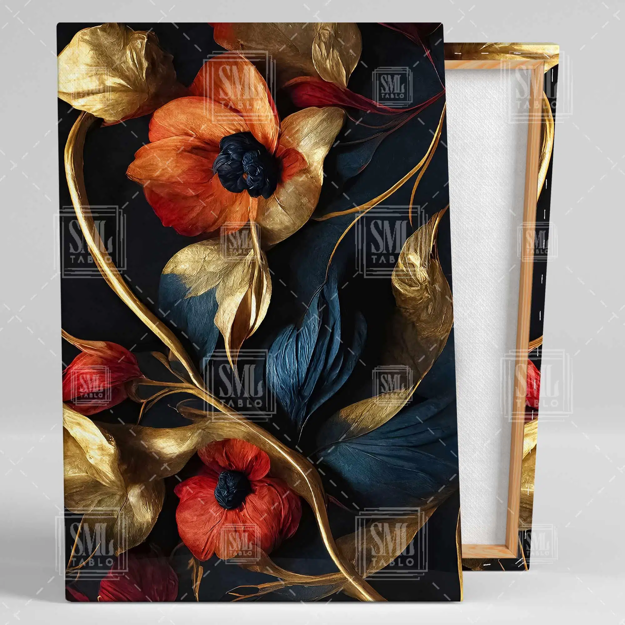 | Etiketler | Mavi Yapraklı Kırmızı Çiçek Gold Detaylar Dekoratif Dikey Kanvas Tablo Tablosu Tabloları Tuvali Poster Posteri |