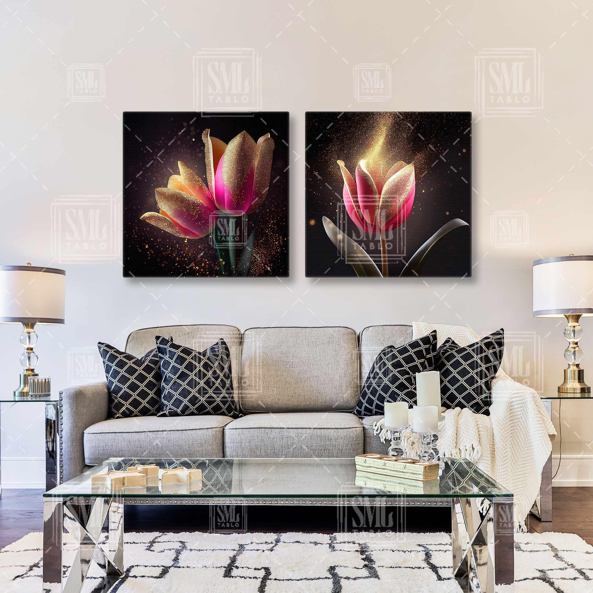 | Etiketler | Pembe Lale Gold Detaylı Altın Pırıltılar Lüks Dekoratif İkili Kombin 2li Kanvas Tablo Tablosu Tabloları Tuvali |