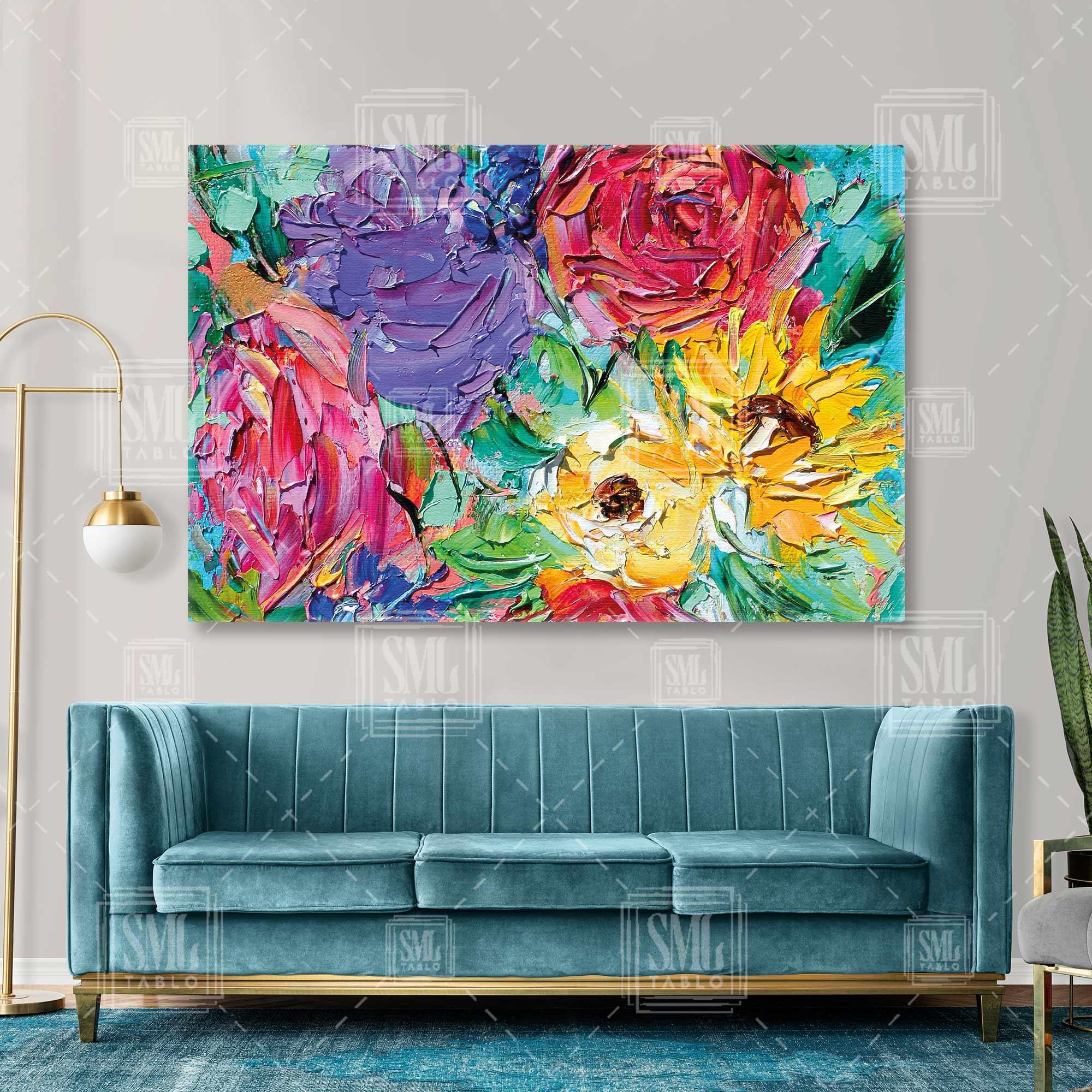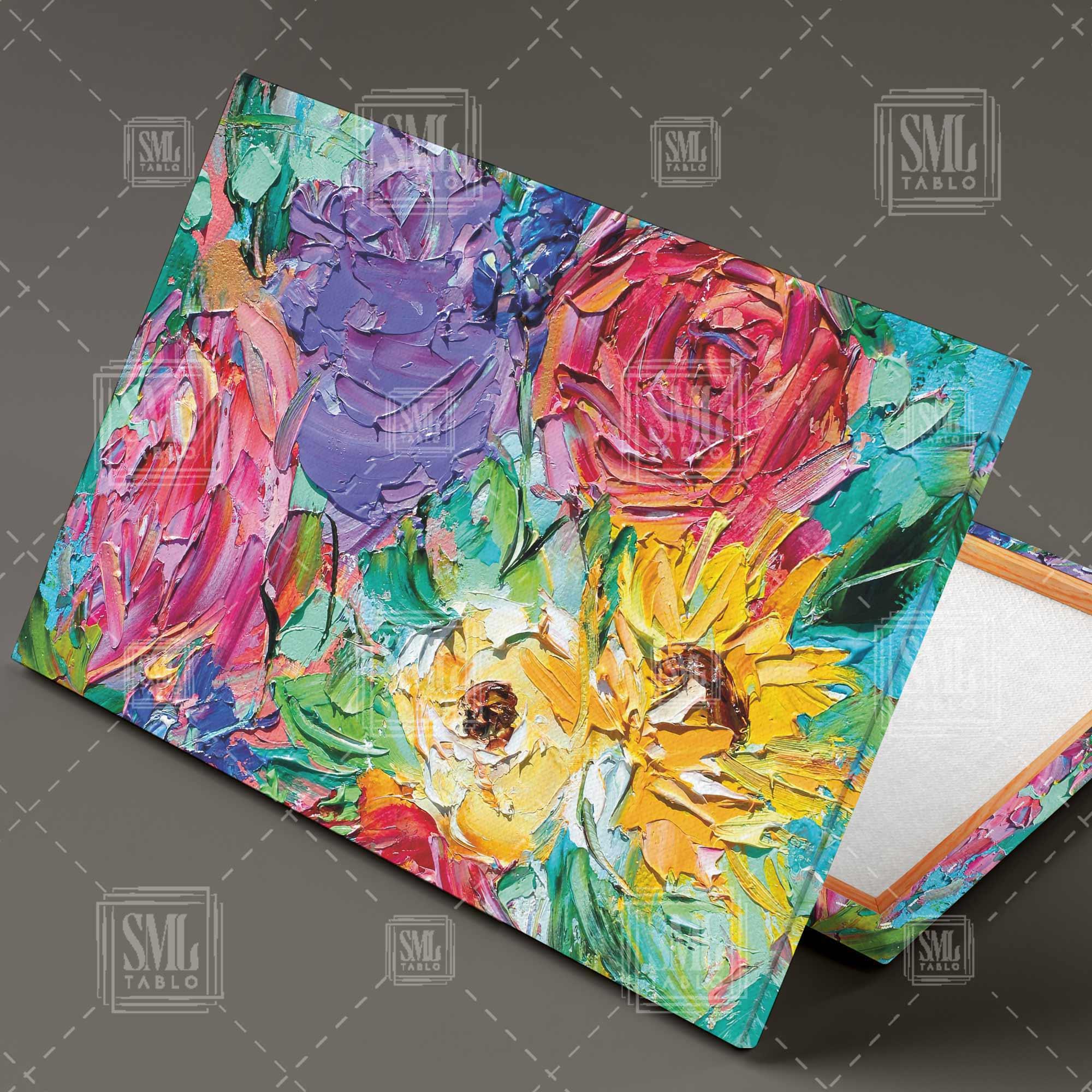 | Etiketler | Pembe ve Mor Çiçeklerle Ayçiçeği Buketi Fırça İzleri Yatay Kanvas Tablo Tablosu Tabloları Tuvali |